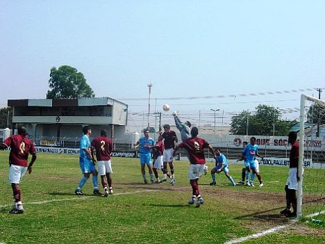Goleiro do Juventus afasta o perigo de sua meta. Foto: Emerson Ortunho.