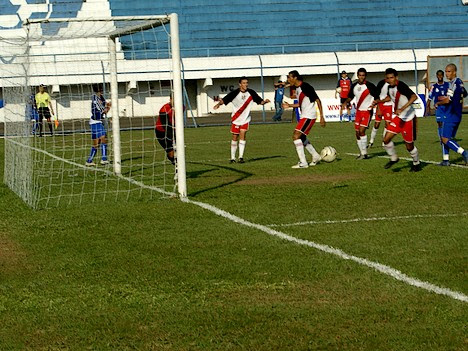 Bola indo contra o poste para depois morrer no fundo da meta do Campo Limpo Paulista. Foto: Orlando Lacanna.