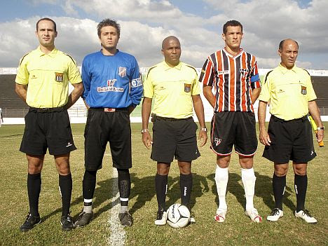 Capitães das equipes e trio de arbitragem composto pelo árbitro Cleverson Inácio e os assistentes Danilo Ricardo Manis e Luiz Antônio Corrêa. Foto: Fernando Martinez.